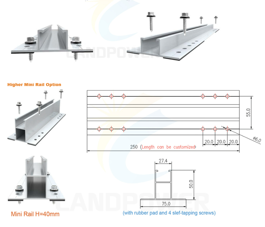Aluminium Mini Rail Solar Mounting System is cost-effective solution for trapezoidal roof,corrugated roof etc, it is easy and simple roof solar mounting systems.